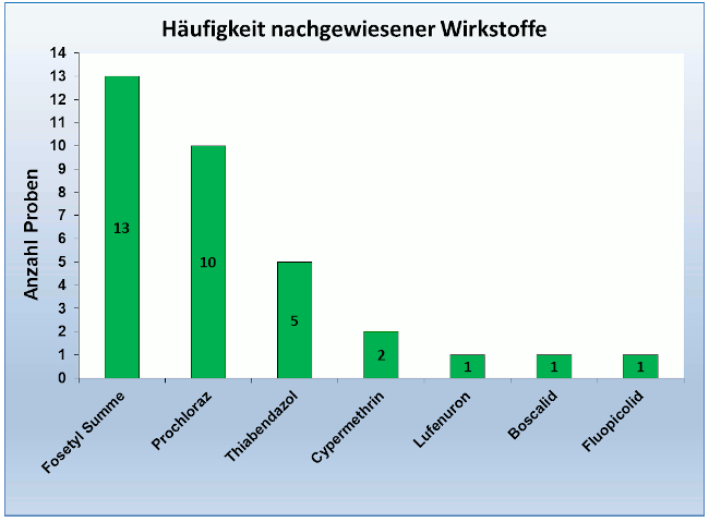 Höchstgehaltsüberschreitungen wurden in je einer Probe aus Chile, Kolumbien und Spanien festgestellt. In der Probe aus Kolumbien traten bei dem Insektizid Lufenuron und in der chilenischen Probe bei der Summe Fosetyl (Summe aus Fosetyl und Phosphonsäure berechnet als Fosetyl) die Höchstgehaltsüberschreitungen auf. Die spanische Probe wies gleich zwei Überschreitungen auf und zwar für die Fungizide Boscalid und Fluopicolid. Jedoch waren die insgesamt vier Höchstgehaltsüberschreitungen alle noch im Bereich der analytischen Messunsicherheit, so dass diese Proben nicht beanstandet werden konnten.