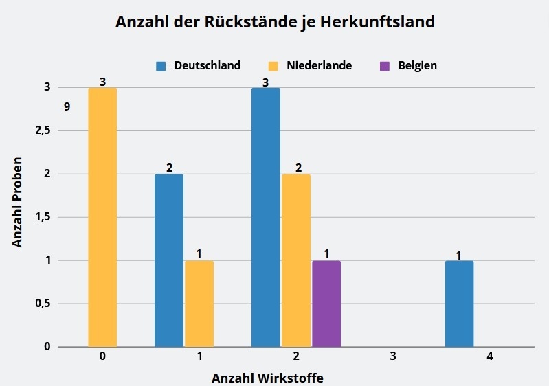 In drei Proben war nur ein Pflanzenschutzmittelwirkstoff bestimmbar und in sechs Proben konnten jeweils zwei Wirkstoffe festgestellt werden. Das Maximum bildeten vier verschiedene Pestizidrückstände in einer Chicoréeprobe aus deutschem Anbau. Sieben Proben (= 54 Prozent) wiesen somit Mehrfachrückstände auf.