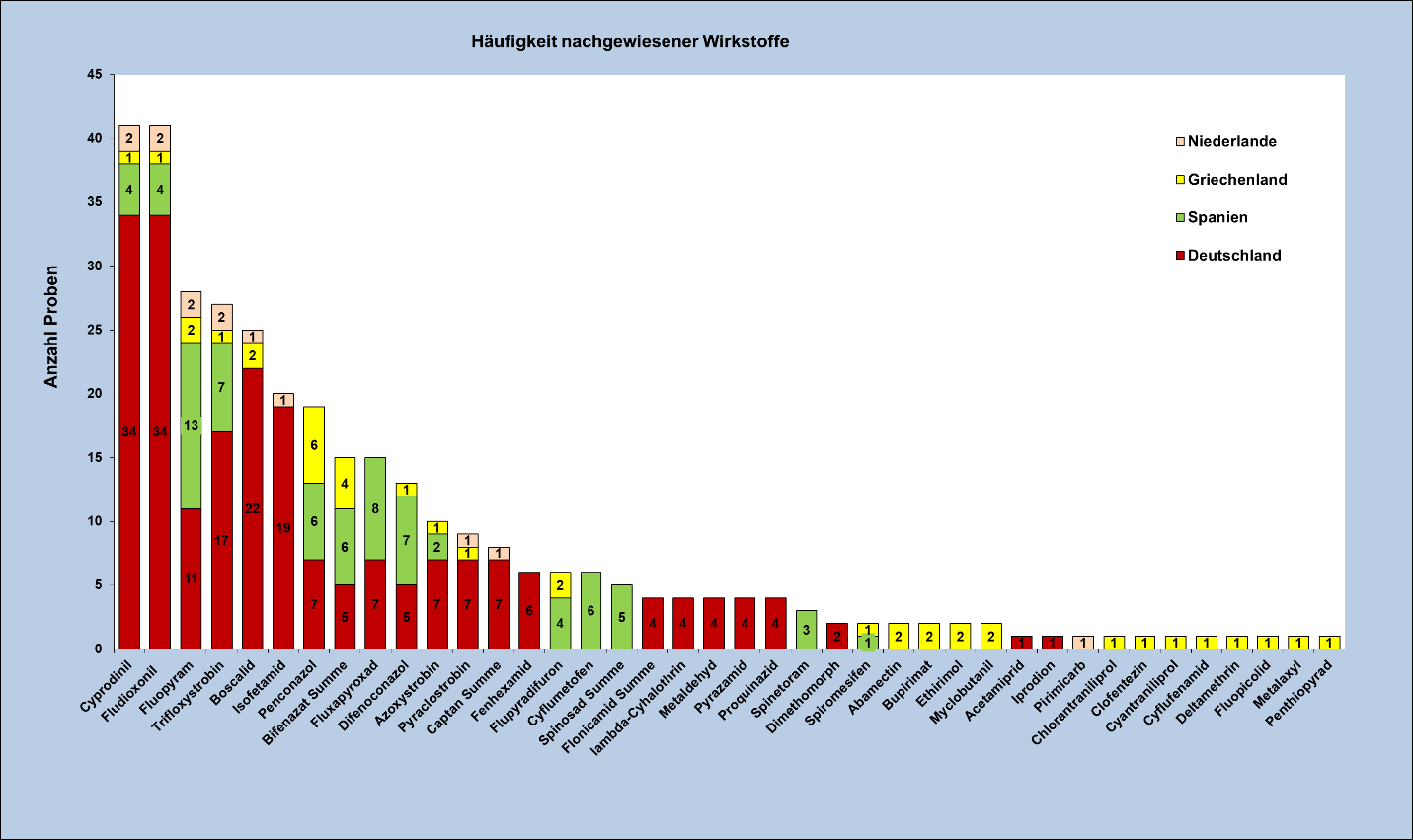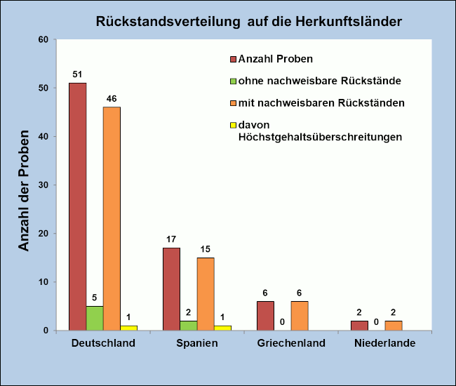 Rückstande von Pflanzenschutzmitteln wurden in 46 Proben aus Deutschland, 15 Proben aus Spanien, sechs Proben aus Griechenland und zwei Proben aus den Niederlanden nachgewiesen.