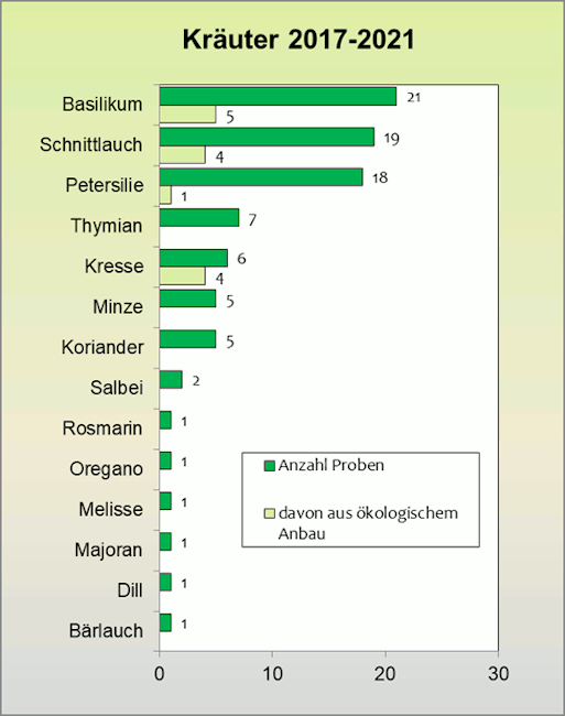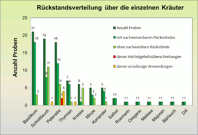 Von 89 Proben Kräutern bestehend aus 14 verschiedenen Erzeugnissen waren 29 Proben rückstandsfrei. 24 Prozent der Proben wiesen Mehrfachrückstände auf, das heißt mehr als zwei Wirkstoffe pro Probe. Basilikum, Schnittlauch und Petersilie machten 65 Prozent des Probenaufkommens aus. In einer Probe Petersilie wurden zwei Höchstgehaltsüberschreitungen festgestellt.