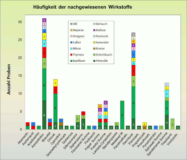 Es konnten in den Kräutern 28 verschiedene Wirkstoffe nachgewiesen werden. Dabei wurden das Fungizid Azoxystrobin und das Insektizid Spirotetramat am häufigsten detektiert. Der Abbildung ist die Verteilung auf die einzelnen Kräuter zu entnehmen. Bezüglich der Wirkstoffe von Chlorat und Perchlorat wird auf die Ausführungen zu diesem Thema auf der LAVES Homepage verwiesen.