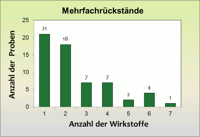 Mehrfachrückstände, das heißt zwei oder mehr Wirkstoffe oder deren Abbauprodukte pro Probe, wurden in 21 Kräutern (24 Prozent) bestimmt (siehe Abbildung vier). Je eine Probe Minze und Basilikum aus Deutschland enthielten fünf Wirkstoffe. Je sechs Wirkstoffe wurden in drei deutschen Proben Petersilie, Schnittlauch und Basilikum sowie in einer Probe Salbei aus Italien nachgewiesen. Die größte Anzahl an Mehrfachrückständen wurde in einer Probe Petersilie aus Spanien detektiert.