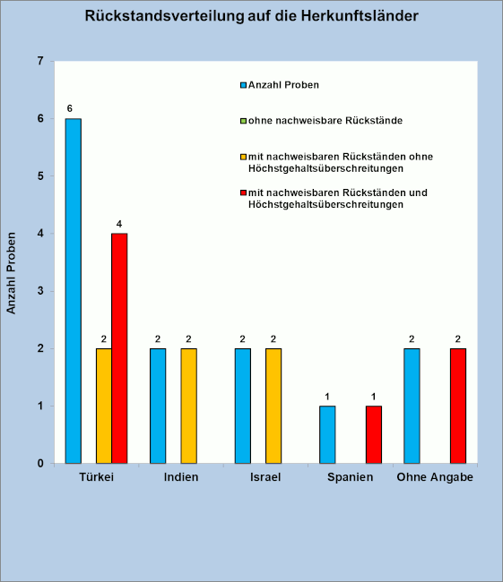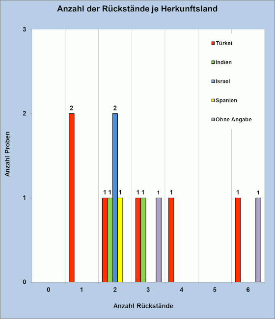 Maximal wurden sechs unterschiedliche Rückstände in je einer Probe aus der Türkei und einer Probe ohne Herkunftsangabe bestimmt.