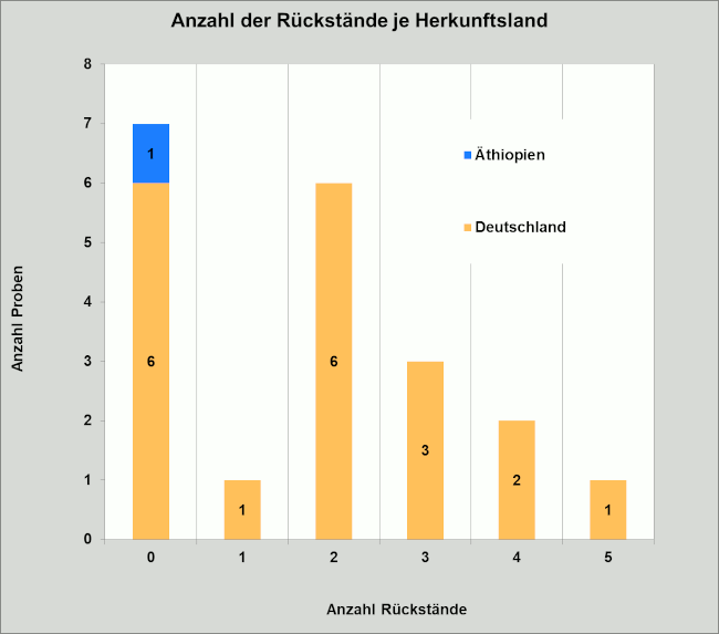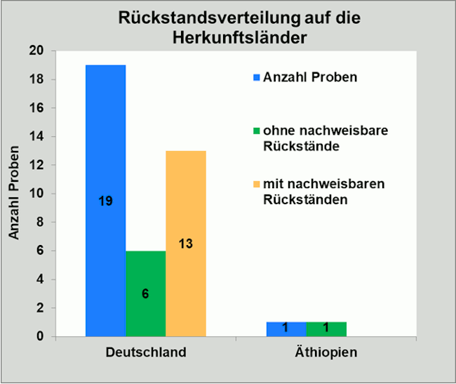 Als Herkunftsländer waren 19-mal Deutschland, darunter zwei Proben aus Bioanbau und einmal Äthiopien angegeben.