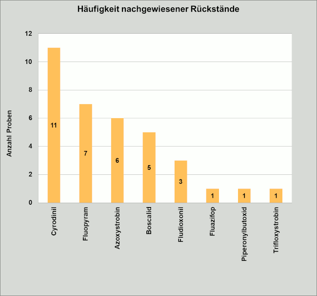 Insgesamt wurden acht verschiedene Rückstände in den Proben bestimmt. Am häufigsten war das Fungizid Cyprodinil (elfmal) in den Proben enthalten.