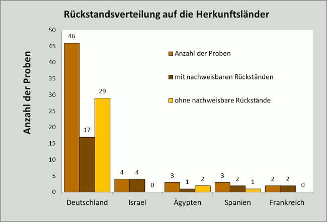 In insgesamt 26 Proben (= 45 Prozent), davon 17 Proben aus Deutschland, in allen vier Proben aus Israel, in den zwei Proben aus Frankreich, in zwei Proben aus Spanien und in einer Probe aus Ägypten wurden Pflanzenschutzmittrückstände nachgewiesen.