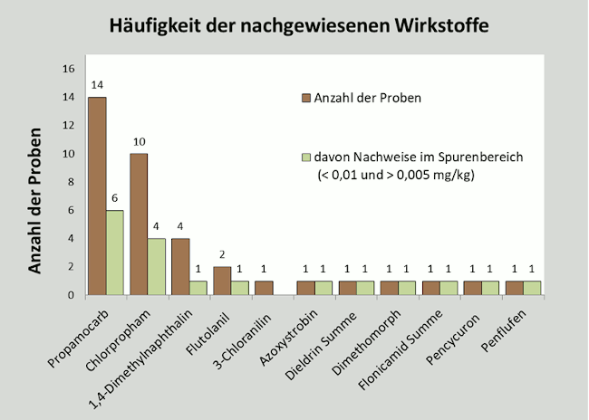 Bedingt dadurch, dass 79 Prozent der Proben aus Deutschland stammten, zeigt sich auch bei der Verteilung der Wirkstoffe ein recht einheitliches Bild (siehe Abbildung drei). Insgesamt wurden elf verschiedene Wirkstoffe detektiert; davon sechs jeweils einmal und ausschließlich im Spurenbereich. Wie auch im vergangenen Jahr wurden die Wirkstoffe Propamocarb (vierzehnmal) und Chlorpropham (zehnmal) am häufigsten nachgewiesen. Die Zulassung des keimhemmenden Mittels Chlorpropham in der EU endete am 31. Juli 2019; der Wirkstoff durfte jedoch noch bis zum 8. Oktober 2020 aufgebraucht werden. Höchstgehaltsüberschreitungen oder Verstöße gegen Kennzeichnungs- beziehungsweise Kenntlichmachungsvorschriften wurden keine festgestellt.