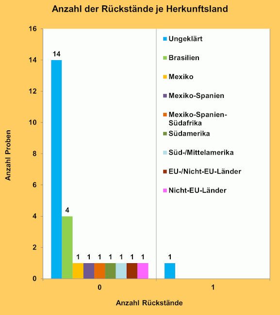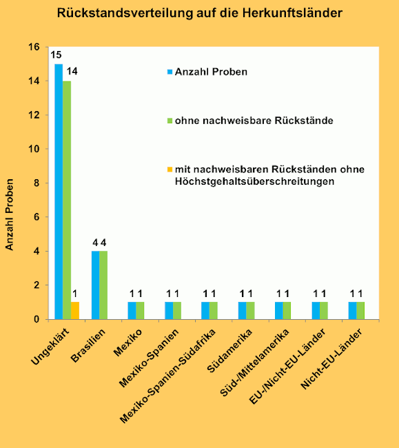 Gemäß Kennzeichnung stammten die zur Produktion verarbeiteten Orangen bei vier Proben aus Brasilien sowie bei jeweils einer Probe aus Mexiko, Mexiko-Spanien, Mexiko-Spanien-Südafrika, Südamerika, Süd-/Mittelamerika, EU-/Nicht-EU-Ländern sowie Nicht-EU-Ländern. Bei 15 Proben blieb das Anbauland der Orangen ungeklärt. Die Angabe des Ursprungs der Rohware ist rechtlich auch nicht erforderlich.