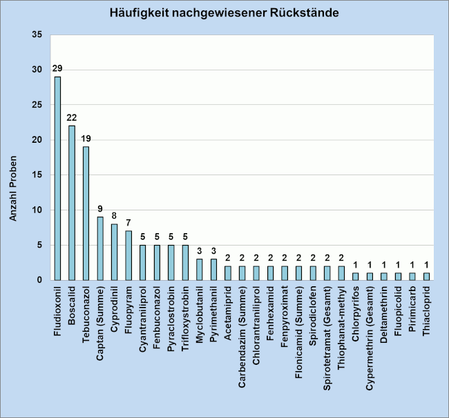 Am häufigsten waren die fungiziden Wirkstoffe Fludioxonil (29-mal), Boscalid (22-mal) und Tebuconazol (19-mal) in den Proben enthalten.