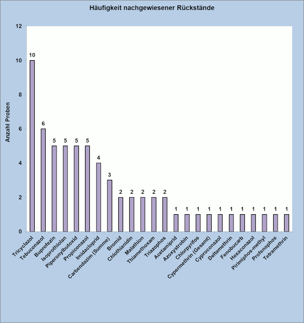 In zehn Proben (= 32 Prozent) wurden Mehrfachrückstände, das heißt zwei oder mehr als zwei Pestizide bestimmt. Besonders auffällig waren die drei Reisproben aus Indien, in denen gesicherte Überschreitungen von Pestizidhöchstgehalten festgestellt wurden. Zwei dieser indischen Reisproben bildeten mit jeweils elf verschiedenen Pestizidrückständen das Maximum an Mehrfachrückständen; die dritte Probe - ein indischer Basmatireis - enthielt neun verschiedene Wirkstoffe.