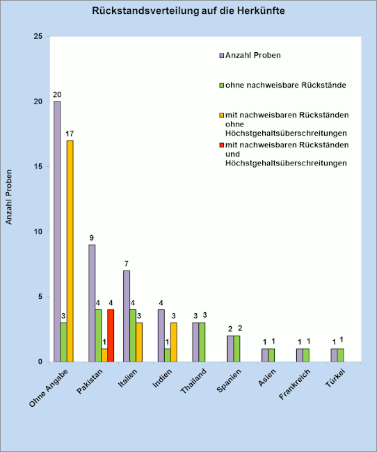 Besonders auffällig sind die Beschwerdeprobe aus Pakistan mit acht verschiedenen Rückständen sowie die zugehörigen drei Verfolgsproben mit acht, neun und zehn verschiedenen Pestizidwirkstoffen. Damit heben sich diese vier Proben deutlich von den übrigen Proben mit maximal vier verschiedenen Pestizidrückständen ab.
