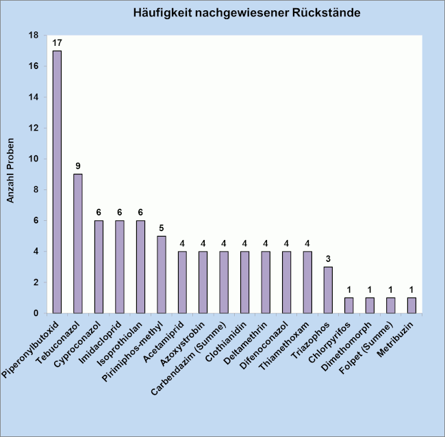 In den Reisproben wurden 18 verschiedene Pflanzenschutzmittelrückstände nachgewiesen -davon am häufigsten Piperonylbutoxid, das 17-mal festgestellt wurde.