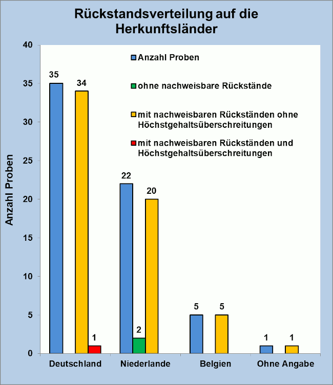 Nur zwei Rosenkohlproben aus den Niederlanden wiesen keine Rückstände von Pflanzenschutzmitteln auf. Hingegen waren Pestizide in allen Proben aus Deutschland und Belgien sowie in der Probe ohne Ursprungsangabe nachweisbar. Insgesamt enthielten 61 (= 97 %) der 63 Proben Pestizidrückstände.