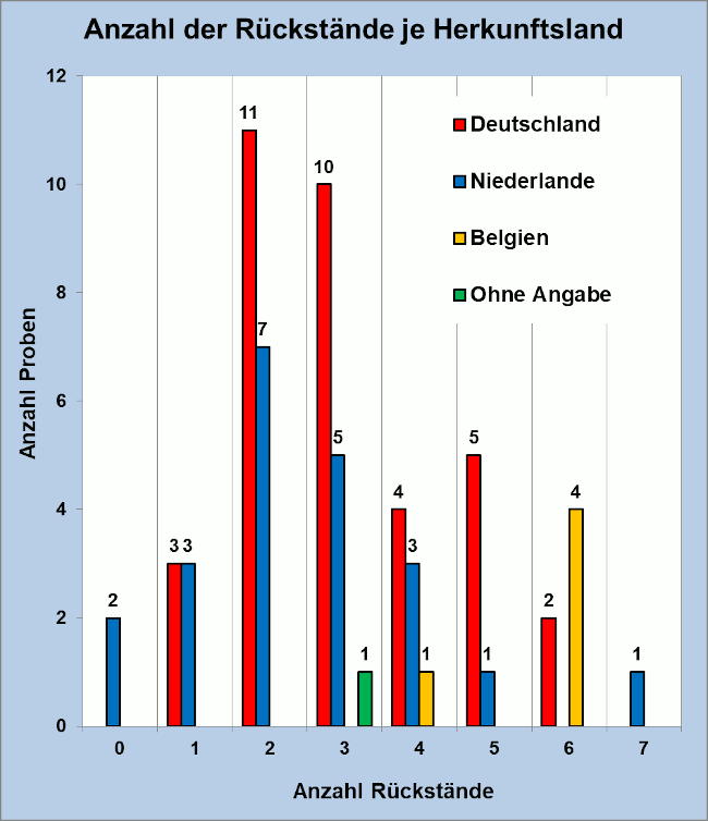 In 55 Proben (= 87 %) der 63 Rosenkohlproben lagen die Wirkstoffe oder deren Metabolite als Mehrfachrückstände vor. Als Maximum wurden in einer niederländischen Rosenkohlprobe sieben unterschiedliche Rückstände bestimmt.