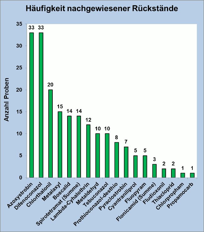 Insgesamt waren 18 verschiedene Pestizidrückstände in den Proben enthalten. Am häufigsten (je 33-mal) wurden die Fungizide Azoxystrobin und Difenoconazol nachgewiesen. In zwei Proben mit Ursprungsangabe Deutschland wurde das für Rosenkohl unzulässige Fungizid Chlorthalonil, in einer Probe das für hiesigen Rosenkohl unzulässige Chlorpropham sowie in einer weiteren deutschen Rosenkohlprobe das ebenfalls unzulässige Fungizid Prothioconazol-desthio bestimmt. Zwei auffällig hohe Gehalte wurden dem Pflanzenschutzamt zur Überprüfung mitgeteilt.