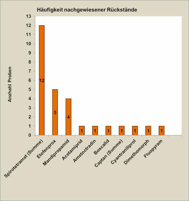 Insgesamt waren in den Proben zehn verschiedene Pestizidrückstände bestimmbar. Mit Abstand am häufigsten (zwölfmal) waren Rückstände des insektiziden Wirkstoffes Spirotetramat in den untersuchten Salatproben enthalten.