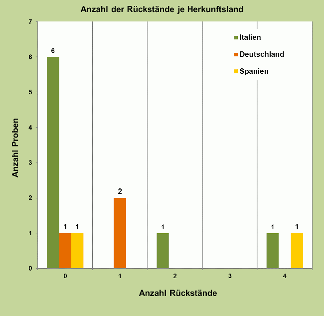Als Anbauländer waren achtmal Italien, dreimal Deutschland und zweimal Spanien angegeben. Alle drei Bioproben waren italienischen Ursprungs.
