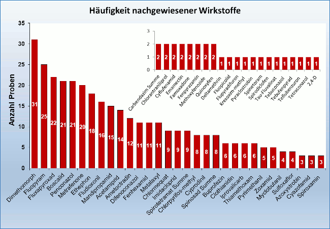Insgesamt wurden 53 verschiedene Wirkstoffe in den Tafeltraubenproben (siehe Abbildung 3) bestimmt. Bei den sechs am häufigsten nachgewiesenen Wirkstoffen handelt es sich um Fungizide. Dimethomorph wurde 31-mal, Fluopyram 25-mal, Fluxapyroxad 22-mal, Boscalid und Penconazol je 21-mal sowie Metrafenon 20-mal detektiert.