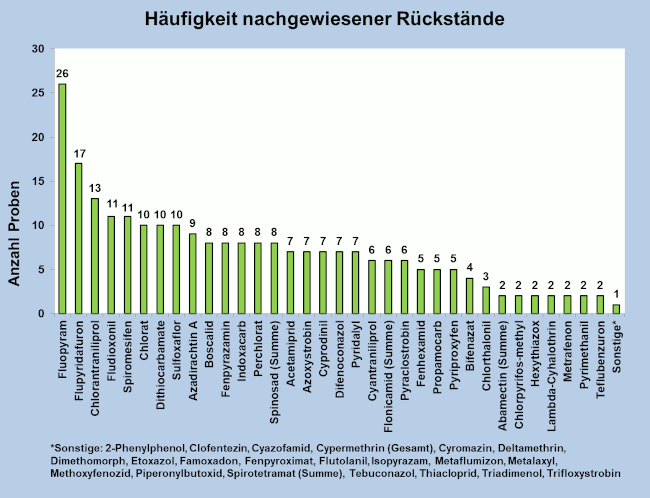 Insgesamt wurden 55 verschiedene Rückstände in den Proben nachgewiesen. Mit Abstand am häufigsten (26-mal) war das Fungizid Fluopyram in den Proben enthalten, gefolgt von dem 17-mal nachgewiesenen Insektizid Flupyridafuron.