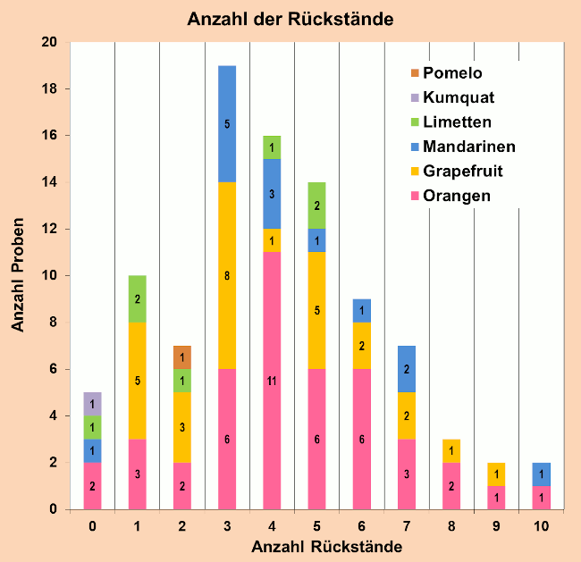 Keine Rückstände waren in insgesamt fünf Proben bestimmbar, darunter zwei Orangenproben sowie jeweils eine Mandarinen-, Limetten- und Kumquatprobe.
