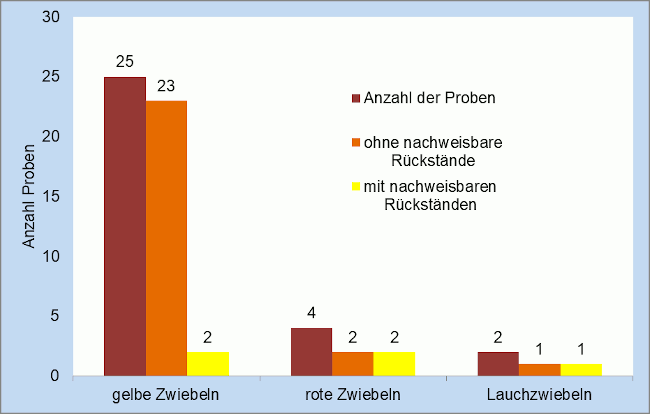 In 26 von 31 Proben wurden keine Rückstände nachgewiesen. In je zwei Proben gelbe und rote Zwiebeln konnte ein Wirkstoff und in einer Lauchzwiebelprobe konnten zwei Rückstände analysiert werden. Eine Höchstgehaltsüberschreitung wurde nicht festgestellt.