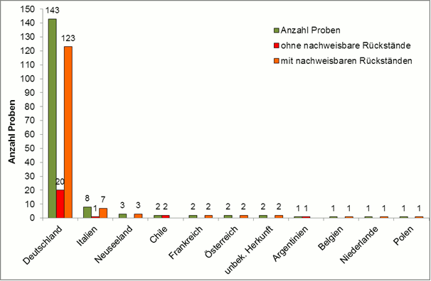 143 Proben Äpfel kamen aus Deutschland, davon 109 aus Niedersachsen. Weitere Proben stammten aus Italien, Neuseeland, Chile, Frankreich, Österreich, Argentinien, Belgien, den Niederlanden, und Polen. Bei 2 Proben war das Herkunftsland nicht bekannt. Die Ergebnisse der Rückstandsuntersuchungen sind in Abbildung 1 zusammengefasst.