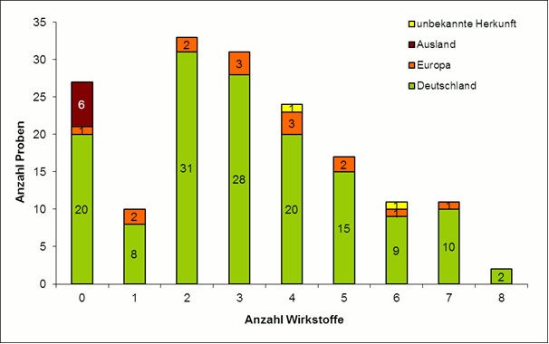 Insgesamt enthielten die untersuchten Proben Äpfel 78% Mehrfachrückstände. In den 144 davon konventionell produzierten Apfelproben waren in 90 % der Proben zwei oder mehrere Wirkstoffe nachweisbar. Hauptsächlich wurden 2 bis 5 Wirkstoffe bestimmt. Zwei Apfelproben aus niedersächsischem Anbau enthielten 8 verschiedene Wirkstoffe (siehe Abbildung 2).