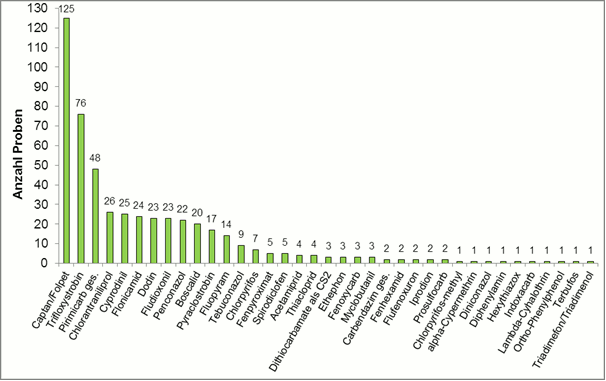 Insgesamt wurden 37 verschiedene Wirkstoffe in den Äpfeln nachgewiesen. In 75 % der Apfelproben wurde das Fungizid Captan (125x) bestimmt, gefolgt von dem Fungizid Trifloxystrobin (76x) und dem Insektizid Pirimicarb (48x).