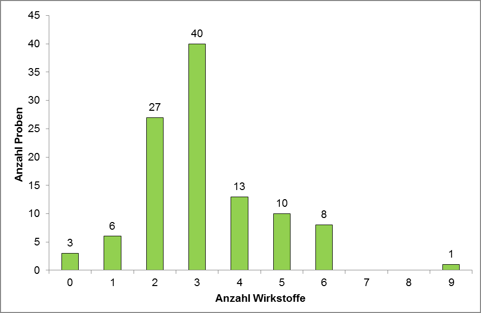 In Abbildung 2 ist die Anzahl der nachgewiesenen Rückstände dargestellt. Insgesamt enthielten 92 % der Apfelproben zwei oder mehr Wirkstoffe (Mehrfachrückstände). Eine Probe deutscher Äpfel enthielt 9 verschiedene Wirkstoffe.