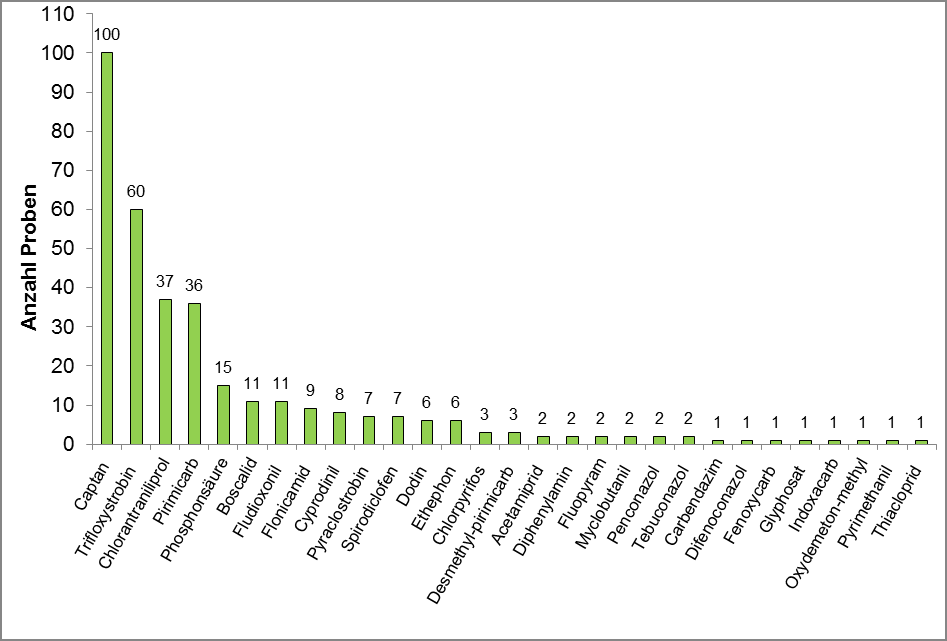 Insgesamt wurden 29 verschiedene Wirkstoffe in den Äpfeln nachgewiesen. In 93 % der Apfelproben wurde das Fungizid Captan (100x) bestimmt, gefolgt von dem Fungizid Trifloxystrobin (60x) und den Insektiziden Chlorantraniliprol (37x) und Pirimicarb (36x).
