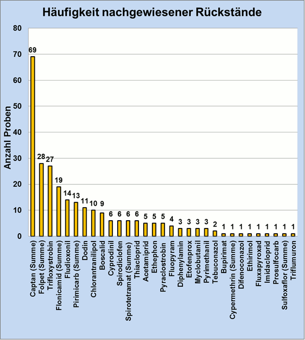 Insgesamt wurden 31 unterschiedliche Pestizidrückstände in den Proben nachgewiesen. Mit 69 Mal am häufigsten waren Rückstände des Fungizids Captan (69 Mal) in den Apfelproben nachweisbar, gefolgt von den ebenfalls fungizid wirkenden Pestiziden Folpet (28 Mal) und Trifloxystrobin (27 Mal).