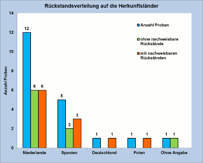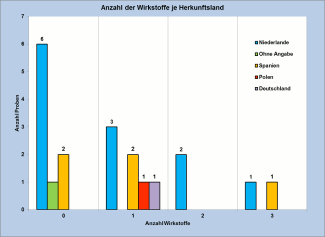 Abbildung 2 zeigt die Anzahl der nachgewiesenen Rückstände in den Auberginenproben, bezogen auf das angegebene Herkunftsland. In 9 Proben (= 45 %), darunter eine Bioprobe, waren erfreulicherweise keine Pflanzenschutzmittel nachweisbar. Mehrfachrückstände (mehr als ein Wirkstoff pro Probe) wurden in 4 Proben (= 20 %) der insgesamt 20 untersuchten Auberginenproben bestimmt. Jeweils 2 Proben enthielten zwei bzw. drei Pestizidrückstände.