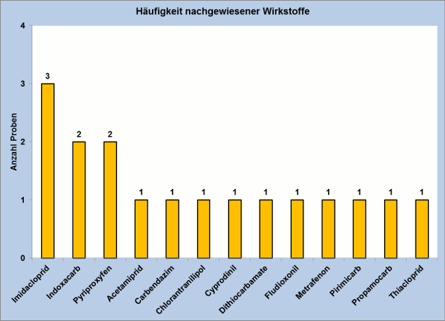 Abbildung 3 präsentiert die in den Proben nachgewiesenen Pflanzenschutzmittelwirkstoffe. Insgesamt wurden 13 verschiedene Pestizidrückstände in den Auberginenproben bestimmt, am häufigsten das systemische Insektizid Imidacloprid (3x).