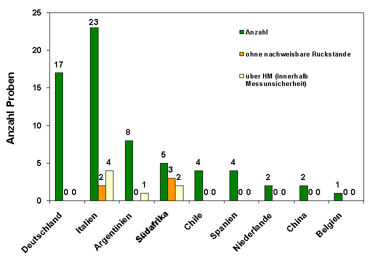 In sieben ausländischen Proben (zwei aus Italien, eine aus Argentinien und zwei aus Südafrika) wurde Höchstmengenüberschreitungen festgestellt. Die Gehalte lagen jedoch noch innerhalb der Messunsicherheit, daher erfolgte keine Beanstandung.