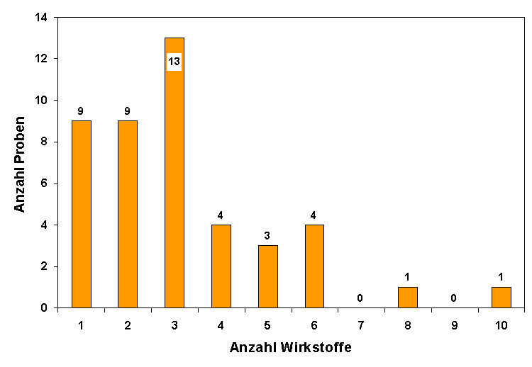 Ausländische und deutsche Birnen enthielten überwiegend drei nachweisbare Wirkstoffe pro Probe. In deutschen Birnen wurden maximal fünf Wirkstoffe gleichzeitig gefunden. Bis zu sechs Wirkstoffe (in vier Proben: je zwei aus Spanien und Italien) wurden in den ausländischen Proben bestimmt. Eine Probe enthielt sogar acht nachweisbare Rückstände, eine weitere zehn; beide Proben stammten aus Italien. Eine Übersicht über die nachgewiesenen Wirkstoffe geben die Abbildungen 2 und 3; die in Spuren gefundenen Gehalte wurden nicht berücksichtigt.