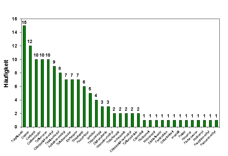 In den Abbildungen 4 und 5 sind die in den ausländischen und deutschen Birnen nachgewiesenen Wirkstoffe aufgeführt. In den ausländischen Birnen konnten 33 verschiedene Wirkstoffe gefunden werden, in den deutschen Proben waren es lediglich neun verschiedene Stoffe. Die Fungizide Captan und Tolylfluanid wurden sowohl in den ausländischen als auch in den deutschen Proben am häufigsten bestimmt.