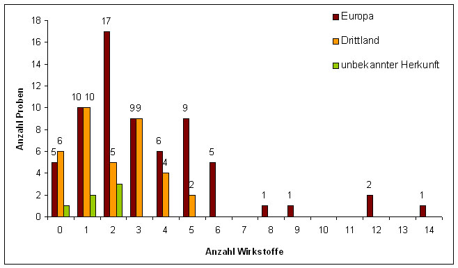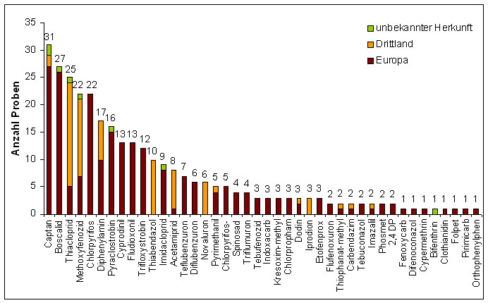 Die drittländischen Birnenproben wiesen maximal 5 Wirkstoffe auf, während in 10 Proben aus Europa 6 oder mehr Rückstände nachgewiesen wurden. Besonders auffällig waren dabei die italienischen Birnen. 2 Proben enthielten 12 bzw. eine Probe 14 verschiedene Wirkstoffe.