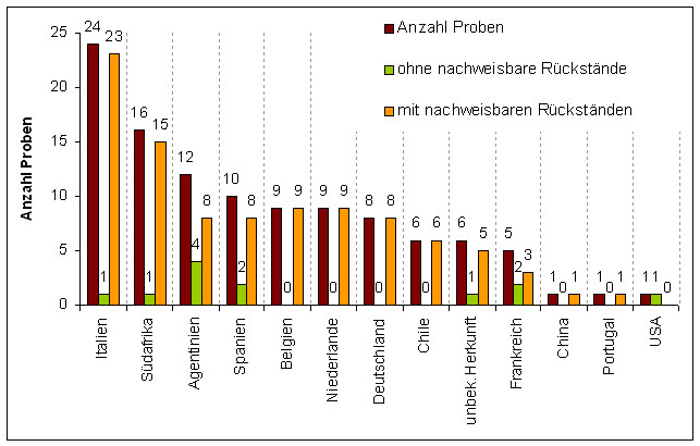 Insgesamt 101 Birnen aus konventionellem Anbau und 7 Proben aus ökologischem Landbau wurden im Jahr 2010 im Lebensmittelinstitut Oldenburg auf Pflanzenschutzmittelrückstände untersucht. Um die Belastungssituation der Birnen ständig zu verfolgen, wurden - gestreut über das ganze Jahr - Rückstandsuntersuchungen durchgeführt. 22% der Birnenproben kamen aus Italien, 15% aus Südafrika sowie 11% aus Argentinien. Weitere Proben stammten aus Spanien (10x), Belgien (9x), den Niederlanden (9x), Deutschland (8x), Chile (6x), Frankreich (5x), China (1x), Portugal (1x) und den USA (1x). Bei 6 Proben war das Ursprungsland nicht angegeben. Die Bioproben hatten ihre Herkunft in Argentinien (4x), Italien (2x) und den USA (1x). Die Ergebnisse der Rückstandsuntersuchungen sind in Abbildung 1 zusammengefasst.
