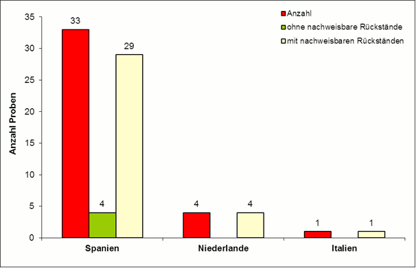Im Lebensmittel- und Veterinärinstitut Oldenburg des LAVES wurden im Jahr 2013 insgesamt 38 Proben Erdbeeren aus dem Ausland auf Pflanzenschutzmittelrückstände untersucht. Eine Probe stammte aus ökologischem Landbau. 33 Erdbeerproben kamen aus Spanien, 4 Proben aus den Niederlanden und eine aus Italien.