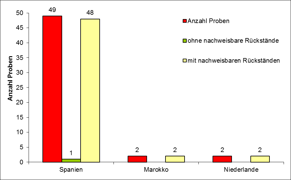 Im Lebensmittel- und Veterinärinstitut Oldenburg des LAVES wurden im März und April 2015 insgesamt 53 Proben konventionell erzeugte Erdbeeren aus dem Ausland auf Pflanzenschutzmittelrückstände untersucht. 49 Erdbeerproben kamen aus Spanien, 2 Proben aus Marokko und zwei aus den Niederlanden.