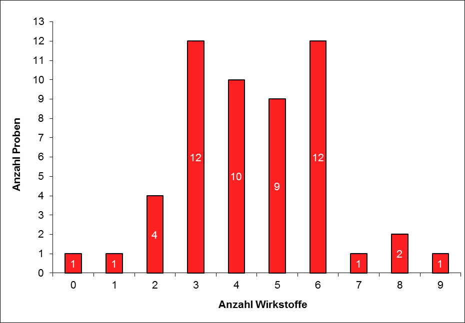 In Abbildung 2 ist die Anzahl der nachgewiesenen Rückstände dargestellt. Mehrfachrückstände, d. h. mehr als ein Wirkstoff je Probe, wurden in 96 % der untersuchten Erdbeeren bestimmt. Hauptsächlich wurden 3 bis 6 Wirkstoffe in den Proben nachgewiesen. Zwei spanische Erdbeerproben enthielten acht und eine weitere Probe aus Spanien neun verschiedene Wirkstoffe.
