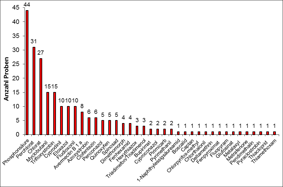 Am häufigsten wurde Phosphonsäure (44x) bestimmt. Rückstände von Phosphonsäure können durch die Anwendung des fungiziden Pflanzenschutzmittelwirkstoffes Fosetyl, der z. B. gegen Pflanzenkrankheiten wie den Falschen Mehltau eingesetzt wird, sowie durch den Einsatz von im Bioanbau erlaubten Phosphordüngern und Pflanzenstärkungsmitteln auftreten.