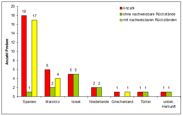 Im Lebensmittel- und Veterinärinstitut Oldenburg des LAVES wurden im 1. Quartal 2013 insgesamt 34 Gemüsepaprikaproben aus konventionellem Anbau auf Rückstände von Pflanzenschutzmitteln untersucht. 18 Proben Gemüsepaprika kamen aus Spanien. Weitere Proben stammten aus Marokko (6), Israel (5), den Niederlanden (2), Griechenland (1) und der Türkei (1). Bei einer Probe war das Herkunftsland nicht bekannt.