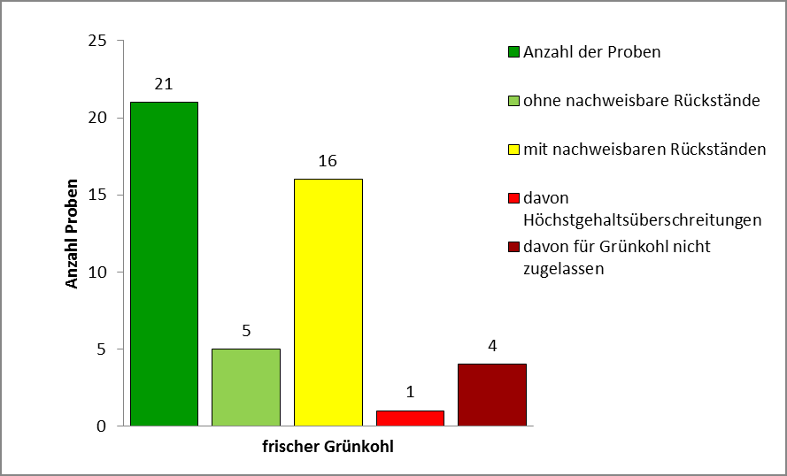 Rückstände oberhalb der rechtlich festgesetzten Höchstgehalte wurden in vier Grünkohlproben festgestellt, allerdings lag in drei Proben der Gehalt nach Berücksichtigung der Messunsicherheit noch im Streubereich des zulässigen Höchstgehaltes. Bei der Höchstgehaltsüberschreitung handelte es sich um den Nachweis des Keimhemmers Chlorpropham.
