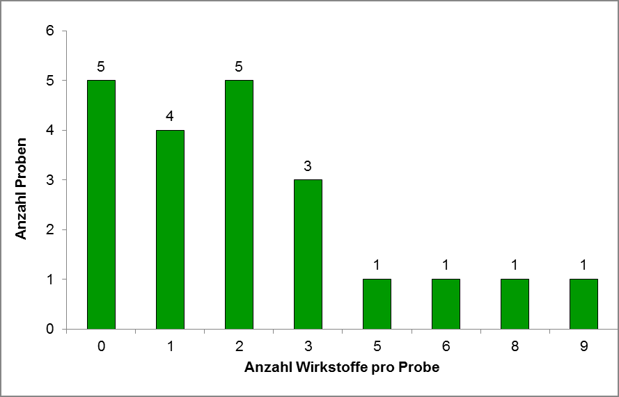Fünf Proben enthielten keine nachweisbaren Pflanzenschutzmittelrückstände (siehe Abbildung 1).