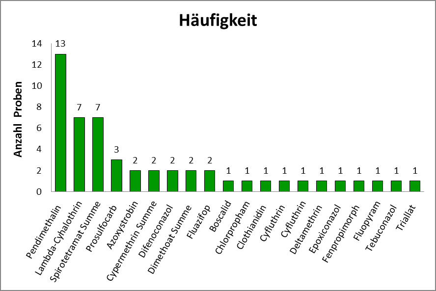 Abbildung 3 zeigt die Häufigkeit der nachgewiesenen Pflanzenschutzmittelrückstände in den Grünkohlproben. Es wurden insgesamt 20 verschiedene Wirkstoffe bestimmt. Hauptsächlich waren das Herbizid Pendimethalin (13x, davon 10x in Spuren), das Insektizid Lambda-Cyhalothrin (7x) und das Insektizid Spirotetramat (7x, davon 2x in Spuren) in den Proben enthalten.