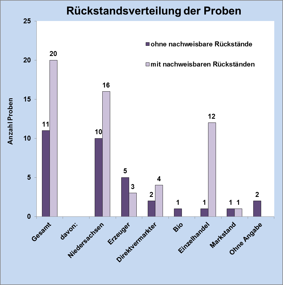 Im Lebensmittel- und Veterinärinstitut Oldenburg des LAVES wurden 2017 insgesamt 31 Proben Heidelbeeren auf Pflanzenschutzmittelrückstände untersucht. Alle Proben kamen aus Deutschland, davon 26 aus Niedersachsen. 16 Heidelbeerproben stammten von Direktvermarktern, vom Marktstand oder vom Erzeuger, 13 Proben wurden im Lebensmitteleinzelhandel (Einzelhandel) entnommen, darunter die einzige Probe Bio-Heidelbeeren.