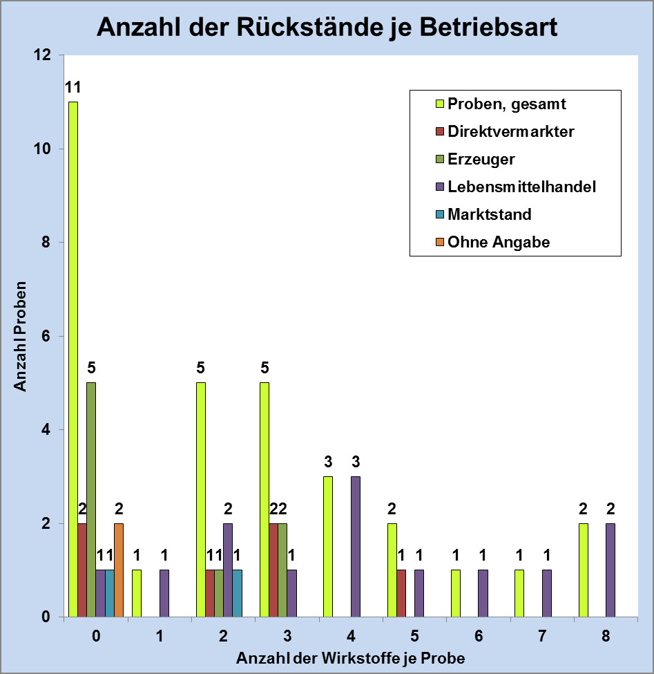 In elf von 31 untersuchten Proben wurden keine Rückstände von Pflanzenschutzmitteln nachgewiesen, hierzu gehörte auch die Bio-Heidelbeerprobe. Insgesamt 19 Heidelbeerproben wiesen Mehrfachrückstände auf (siehe Abbildung 2). Höchstgehalte wurden nicht überschritten.