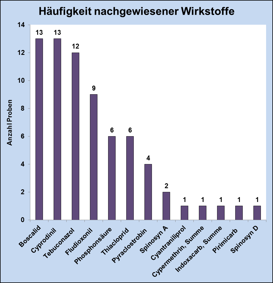 In den Heidelbeerproben konnten 13 verschiedene Wirkstoffe, Fungizide und Insektizide, nachgewiesen werden (siehe Abbildung 3). Am häufigsten wurden in den Proben die Wirkstoffe Boscalid und Cyprodinil (je 13x) bestimmt.