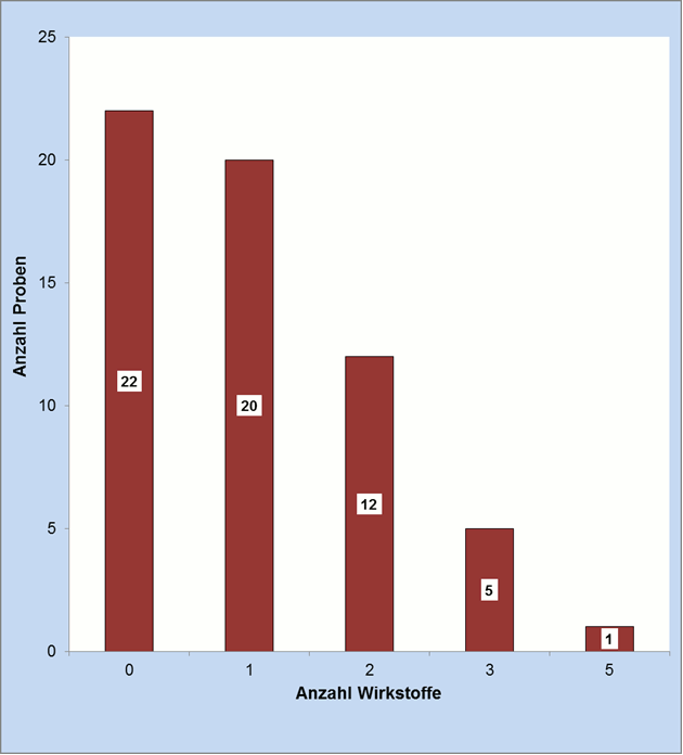 20 Kartoffelproben enthielten je Probe jeweils ein Rückstand, 12 enthielten zwei, bei fünf Proben wurden je drei Rückstände und bei lediglich einer Probe wurden fünf verschiedene Wirkstoffe nachgewiesen (siehe Abbildung 2). Bei 42 % der nachgewiesenen Wirkstoffe lagen die ermittelten Gehalte unterhalb der jeweiligen Bestimmungsgrenze.